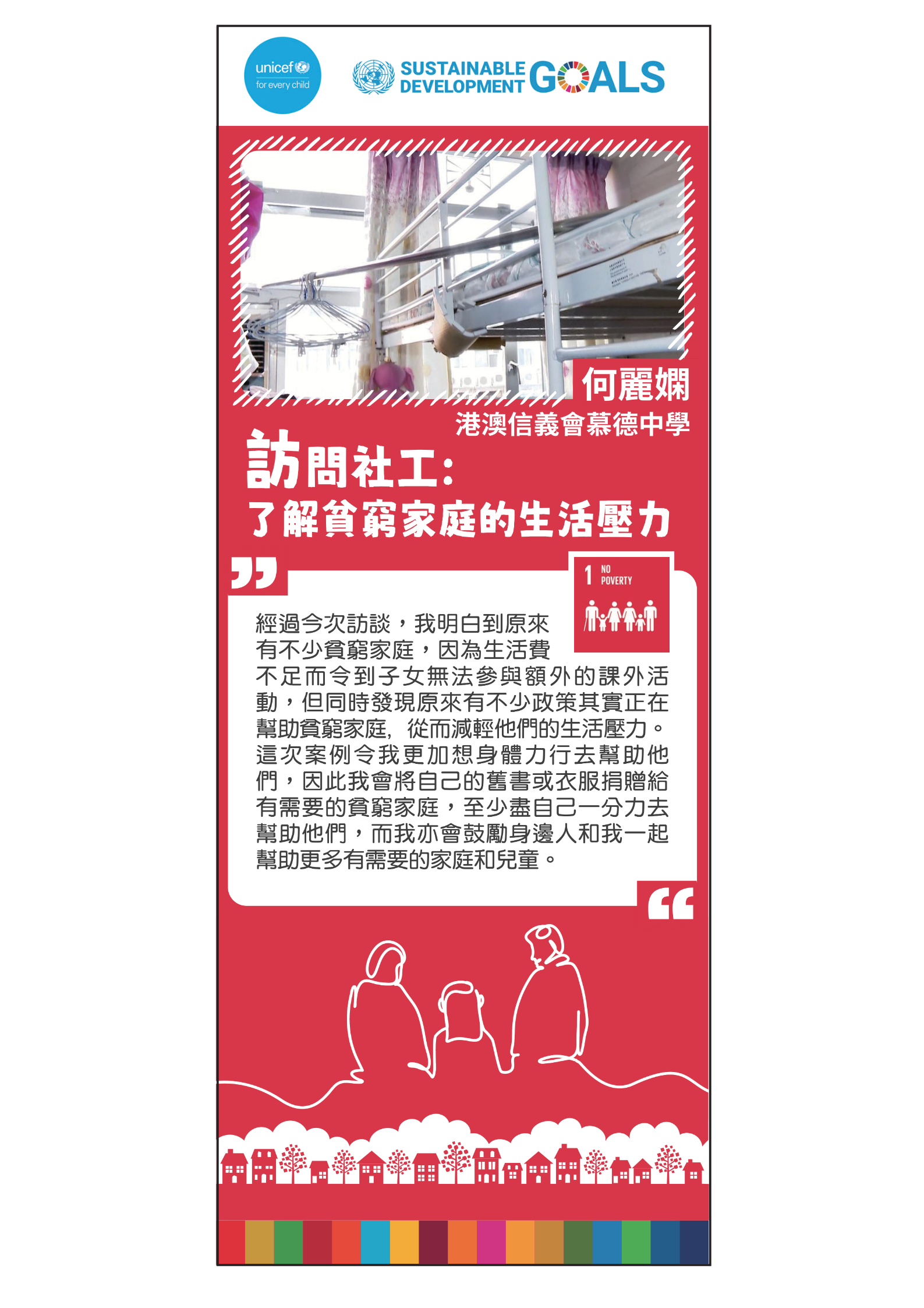 何同學與社工的訪談中, 了解到現時貧窮家庭所面對的問題, 尤其因為資源不足而影響貧窮家庭的兒童的學習體驗和參與課外活動的機會。