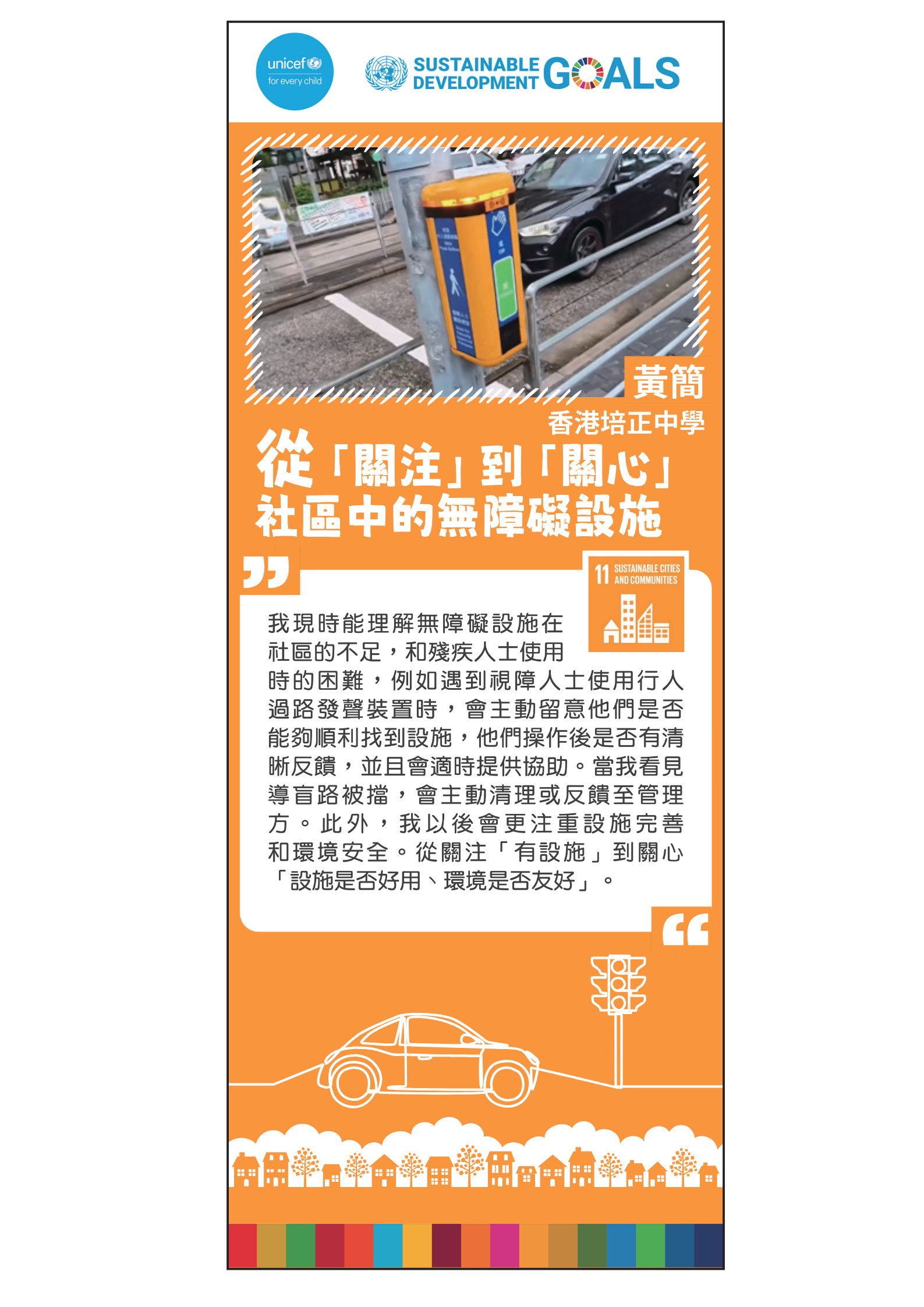 黃同學通過觀察社區內的無障礙設施, 分析各類無障礙設施如何便利殘疾人士出行, 並就現存設施的限制, 提出各項將設施完善的建議。