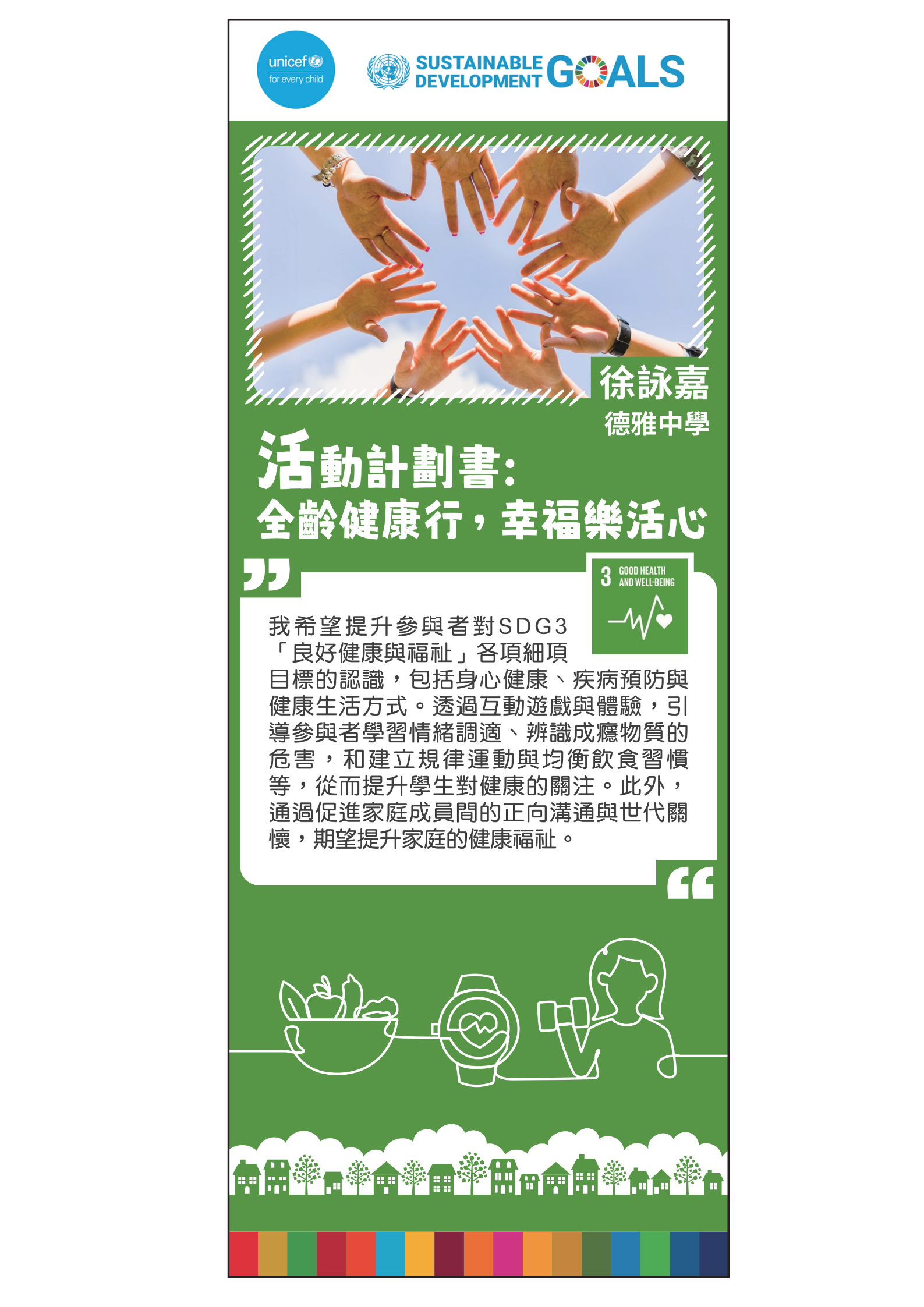 徐同學針對現代社會所面臨的多重健康挑戰, 提出一個寓教於樂的活動方案, 以互動性強的攤位遊戲結合多元的健康議題, 以提升小學生對健康的關注, 並加強人與人之間的連繫, 提倡建立一個擁有良好健康和福祉的社區。