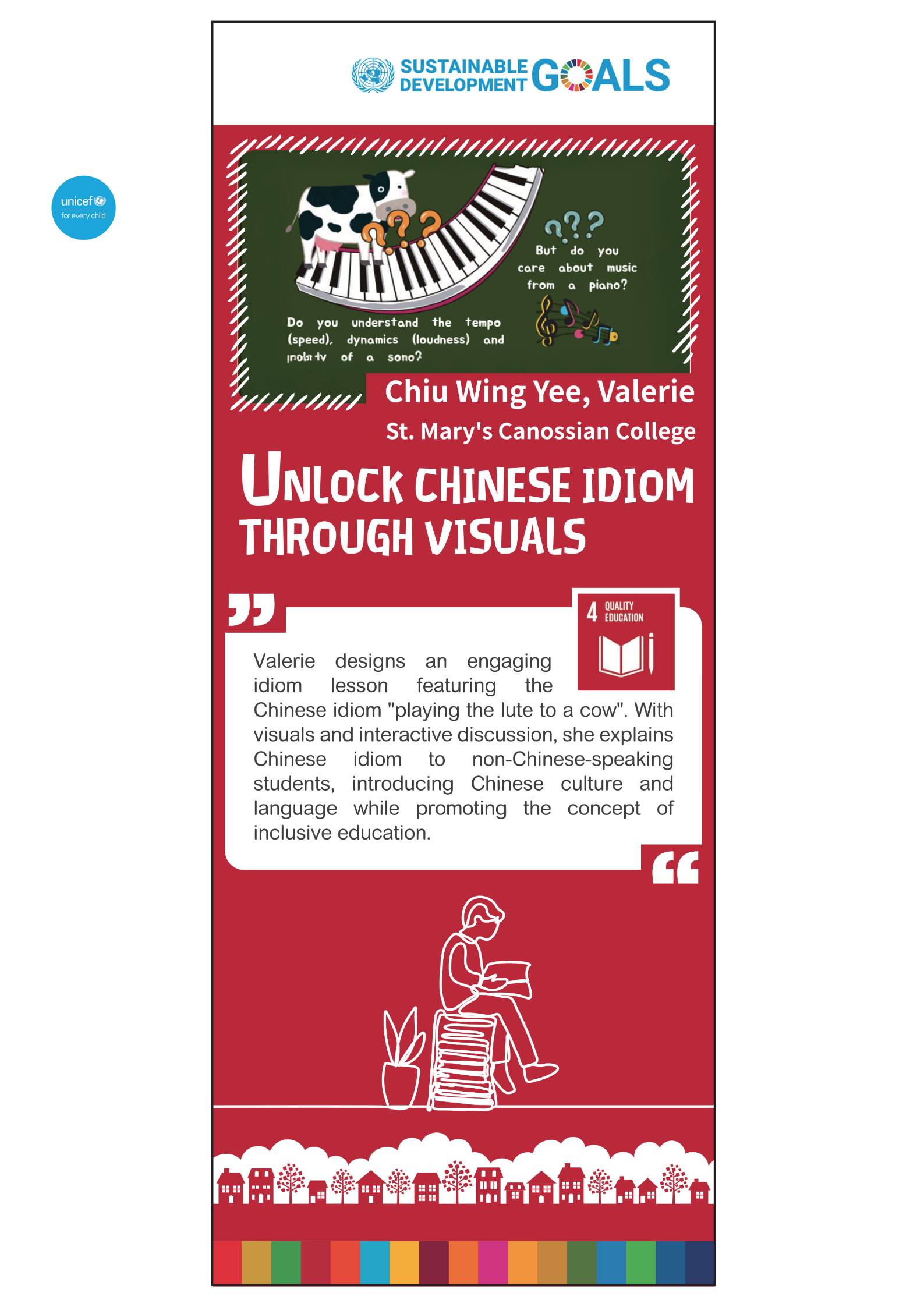 Valerie designs an engaging idiom lesson featuring the Chinese idiom "playing the lute to a cow". With visuals and interactive discussion, she explains Chinese idiom to non-Chinese-speaking students, introducing Chinese culture and language while promoting the concept of inclusive education.